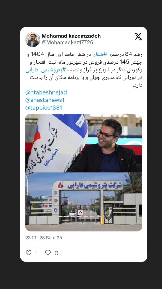 به گزارش نفیرنفت | شبکه خبری صنعت نفت ایران؛  محمد کاظم زاده روابط عمومی پتروشیمی فارابی در شبکه اجتماعی ایکس نوشت: