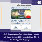 رینگ بینالملل بازار فیزیکی بورس انرژی ایران شاهد ثبت نخستین معامله محموله متانول شرکت پتروشیمی فنآوران عرضه شده توسط کارگزاری صباتامین به مقصد چین بود.